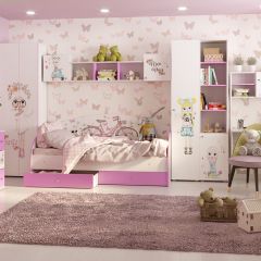 Также под спальным местом предусмотрен классически двустворчатый шкаф, в котором можно разместить одежду, и рабочее место – стол и полка для мелочей или канцелярских принадлежностей. Вместе со шкафом-пеналом той же серии, кровать-чердак «Тея» образуют оптимальный комплект мебели, в котором есть все необходимое для обустройства детской комнаты, при этом он достаточно компактен и не загромождает пространство.